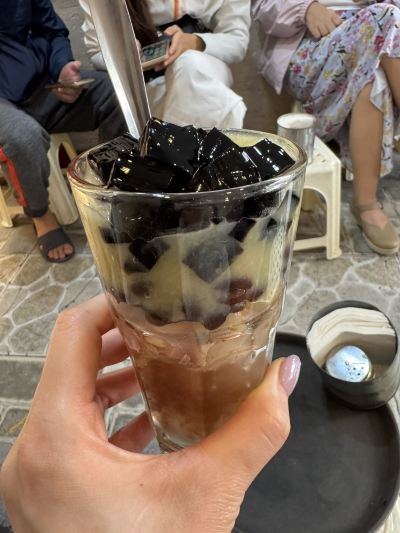 A must-visit online-famous sweet soup shop in Hanoi 👍 This place is incredibly popular; even after 8pm, it's still packed. It's located in the Old Quarter and very easy to find, close to Sanshiliuhang Street! They specialize in local Vietnamese sweet soups. 🈶️ There are two shops: one with benches, and the other across the street has two floors, so you can sit upstairs for a better view! ~ Don't worry if you don't understand Vietnamese; the menu 🈶️ also has pictures in English, clearly showing the ingredients! The prices are reasonable, and the wait is a reasonable ten minutes! ~ I ordered a red bean grass jelly ice cream. It was a bit sweet, even for someone like me who can handle sweets, but it was refreshing with the ice, so it was still quite good and not too cloying! ~ I saw the flower in the drink the kid next to me ordered, so I ordered one too. It was just the right amount of sweetness—refreshing and just the right amount. I love it 👍