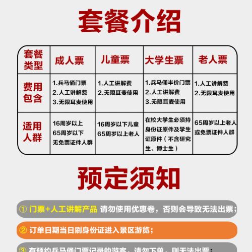1. General admission ticket to the Terracotta Warriors and Horses of Emperor Qin Shi Huang [In case of special circumstances, the merchant will refund travelers' accounts but will not be liable for compensation]; 2. Free use of wireless earphones [Damage fee: CNY 100]; 3. In-depth live guide [Approx. 120 min detailed explanation, non-refundable if unused]; 4. Please collect your earphones at the shuttle bus station 50m directly behind the Emperor Qin Shi Huang statue and enter the site together with the guide.