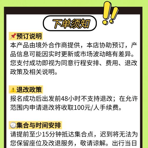 3. The itinerary description is for reference only. Details such as departure time, duration, sightseeing, and attraction photos are all subject to change. The driver/guide may adjust specific tour arrangements based on actual conditions for the safety and convenience of all travelers. Please show understanding and cooperation. Our store does not accept claims based on discrepancies between the actual experience and the product description or images.