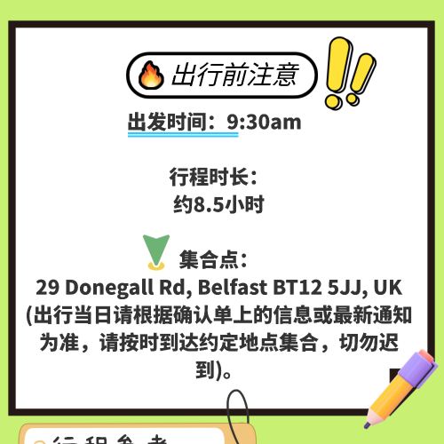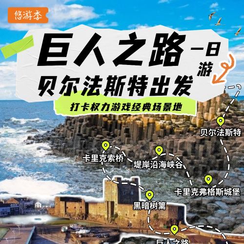 The journey begins in Belfast, exploring the beautiful Northern Ireland and the Giant's Causeway. A short drive takes you to the first stop: Carrickfergus Castle, a 12th-century Norman castle. Capture photos of the castle and harbor here. Travel along the Antrim Coast Road, passing through nine glens and small towns. Listen to tales of fairies in the glens along the way. Drive through Glenarm, passing by Carnlough Harbour, Waterfoot Cave, and Cushendun's Curfew House. Cross Glencorp and Glendunn, pass the coastal town of Ballycastle, and arrive at Portaneevy Viewpoint to admire the Carrick-A-Rede Rope Bridge, with views of the Kintyre Peninsula and Rathlin Island. Head to The Dark Hedges, known as the King's Road in "Game of Thrones." Stroll through the trees. Enjoy lunch (at your own expense) at a traditional pub en route. The Old Bushmills Distillery, a popular local representative of traditional English whiskey production, is a favored stop about 10 minutes from the Giant's Causeway. The guide will arrange a visit based on the day's schedule, but this is not a mandatory shopping activity—only for optional exploration. Pass by Carnlough Harbour and the Magharmorne Quarry, home to the Black Castle, before arriving at the Giant's Causeway to learn about the legend of the giant Finn MacCool. After the visit, return to Belfast via an inland route, concluding a delightful journey!