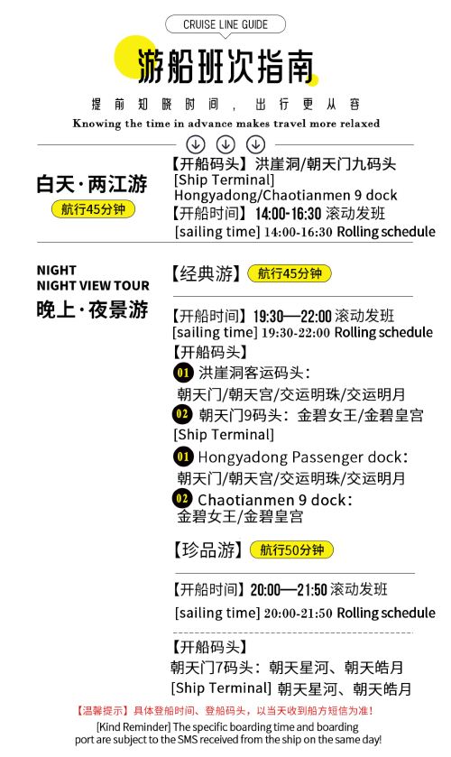 2. The specific departure time may be adjusted temporarily based on the current cruise schedule and market conditions. Please refer to the actual departure time on the day of ticket collection. We appreciate your understanding and support!