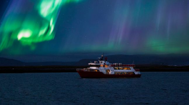 Itinerary for reference (subject to change): Board the cruise and embark on a night tour as we sail into Faxa Bay, taking in the panoramic view of Reykjavik's illuminated coastline, including the Harpa Concert Hall, Hallgrímskirkja Church, and the city's dazzling skyline reflected on the water. Then, we'll turn our gaze to the northern sky in search of the mesmerizing Northern Lights. As the Imagine Peace Tower lights up, we'll sail past it to admire its powerful beam—a highlight eagerly anticipated by our guests. Later, as we sail away from the city, we'll once again focus on the northern horizon, watching for the enchanting auroras dancing across the sky. You can relax in the warm and cozy indoor salon or head to the 360° observation deck for unobstructed breathtaking views. Warm overalls are available for borrowing onboard, and the café serves hot drinks and snacks to keep you comfortable throughout the journey.