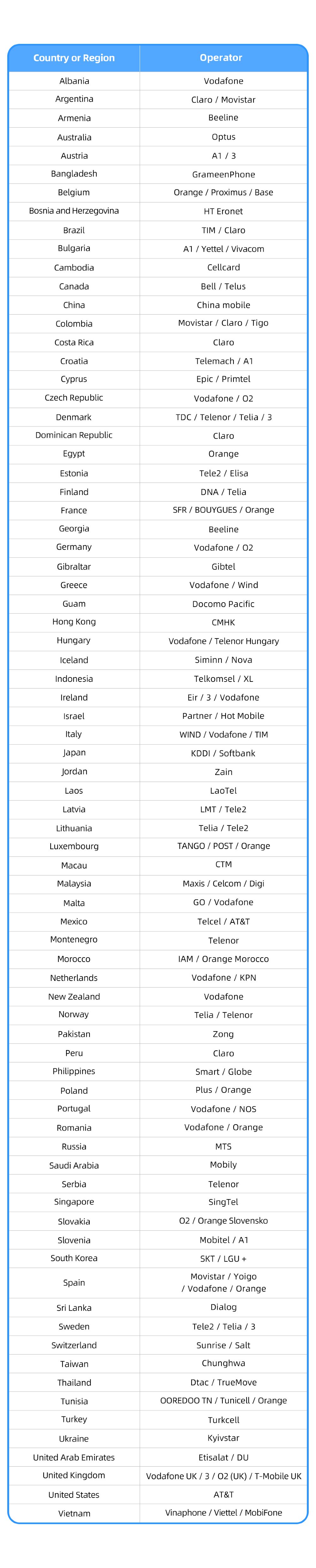 • Signal coverage: Albania, Argentina, Armenia, Australia, Austria, Bangladesh, Belgium, Bosnia and Herzegovina, Brazil, Bulgaria, Cambodia, Canada, China, Colombia, Costa Rica, Croatia, Cyprus, Czech Republic, Denmark, Dominican Republic, Egypt, Estonia, Finland, France, Georgia, Germany, Gibraltar, Greece, Guam, Hong Kong, Hungary, Iceland, Indonesia, Ireland, Israel, Italy, Japan, Jordan, Laos, Latvia, Lithuania, Luxembourg, Macau, Malaysia, Malta, Mexico, Montenegro, Morocco, Netherlands, New Zealand, Norway, Pakistan, Peru, Philippines, Poland, Portugal, Romania, Saudi Arabia, Serbia, Singapore, Slovakia, Slovenia, South Korea, Spain, Sri Lanka, Sweden, Switzerland, Taiwan, Thailand, Tunisia, Turkey, Ukraine, UAE, UK, USA, Vietnam