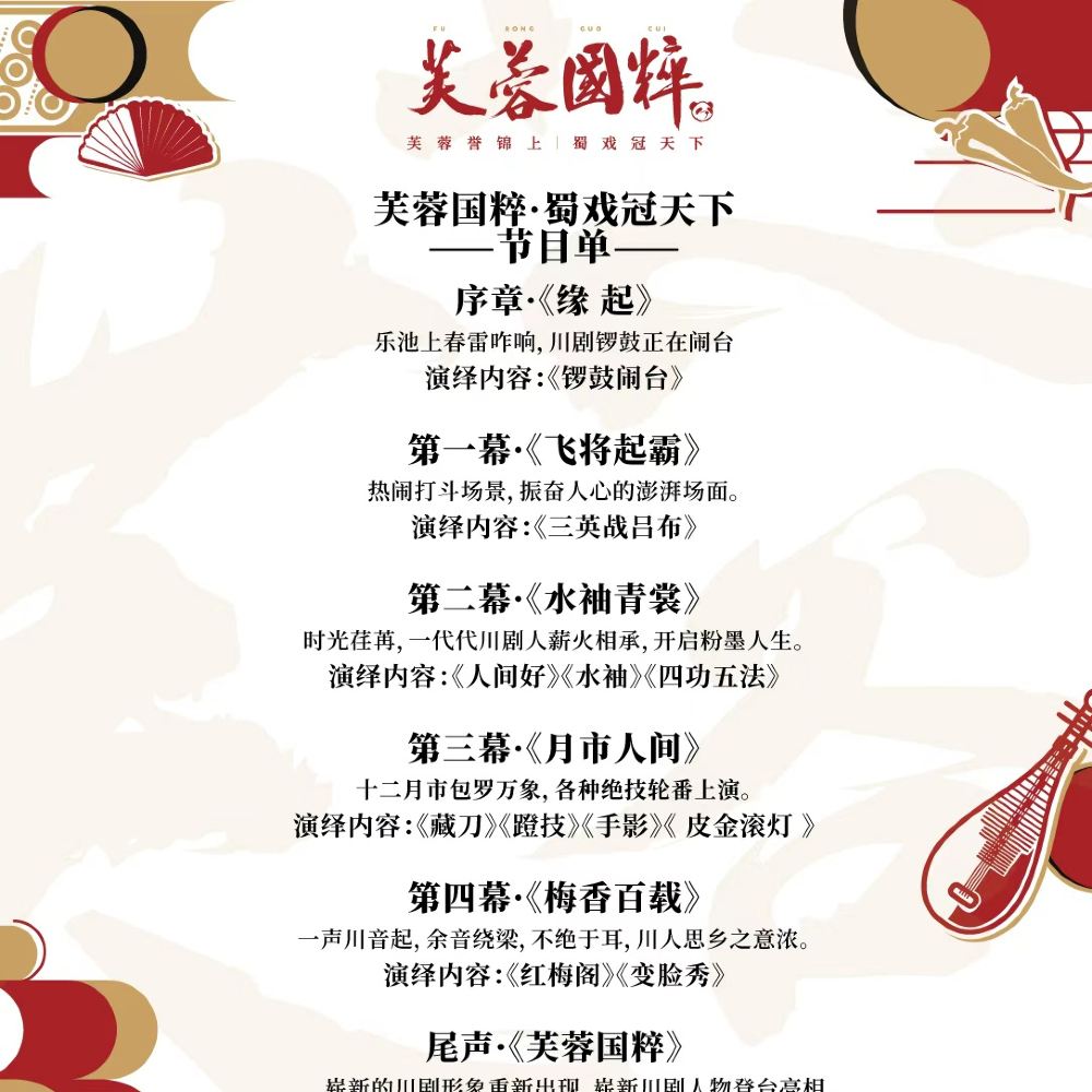 - "Furong Guocui" is performed at Jinjiang Theater, featuring renowned Sichuan Opera artists from Chengdu. The show presents classic Sichuan Opera repertoire, highlighting unique skills such as rolling lamps, fire spitting, and face changing. Every evening at Jinjiang Theater, it offers an extraordinary "Sichuan Opera Extravaganza" for tourists visiting Sichuan.