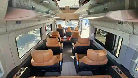 Relax in a luxury limousine bus with amenities like WiFi and drinks