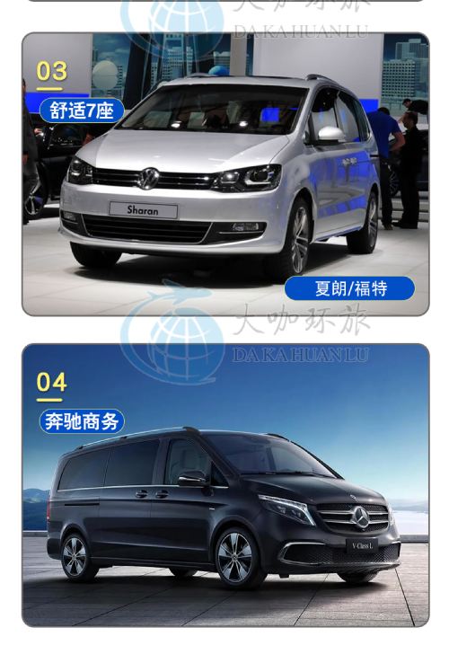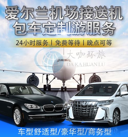 Airport transfer services throughout Ireland, private chartered tours, and customized tour services. Offering various vehicle types including 5-seater/7-seater and 8-seater/9-seater options with Chinese-speaking drivers and dedicated car services.