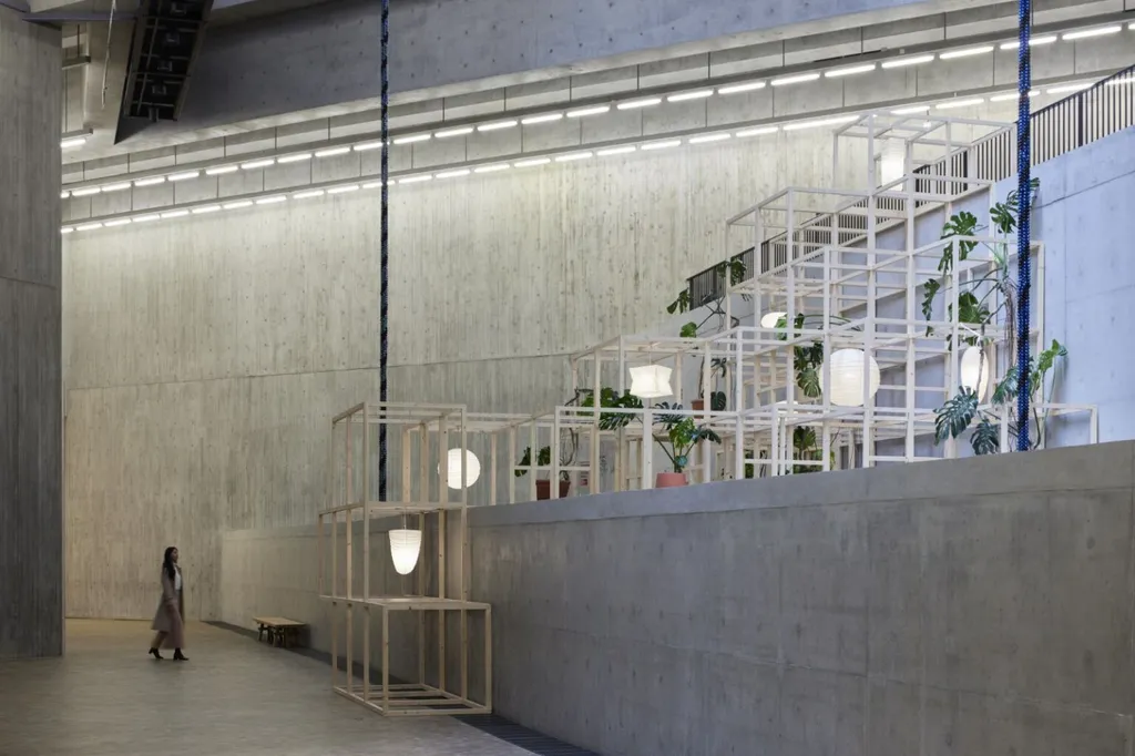 Artist Danh Vo transformed the dormant space into a cozy social environment, presenting artist Isamu Noguchi's Akari lamp sculptures paired with tropical plants, inviting viewers to slow down and spend time.
